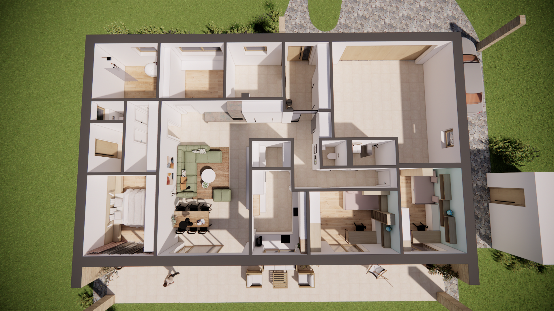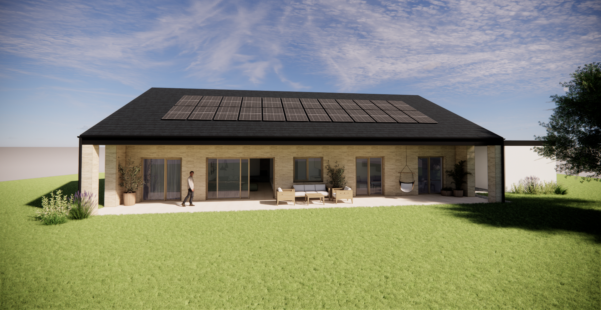 Stavba je energeticky plusová a velmi soběstačná, ať už jde o energie, elektřinu nebo vodu. Dům byl optimalizován a vyhovuje požadavkům na dotaci Nová zelená úsporám.
