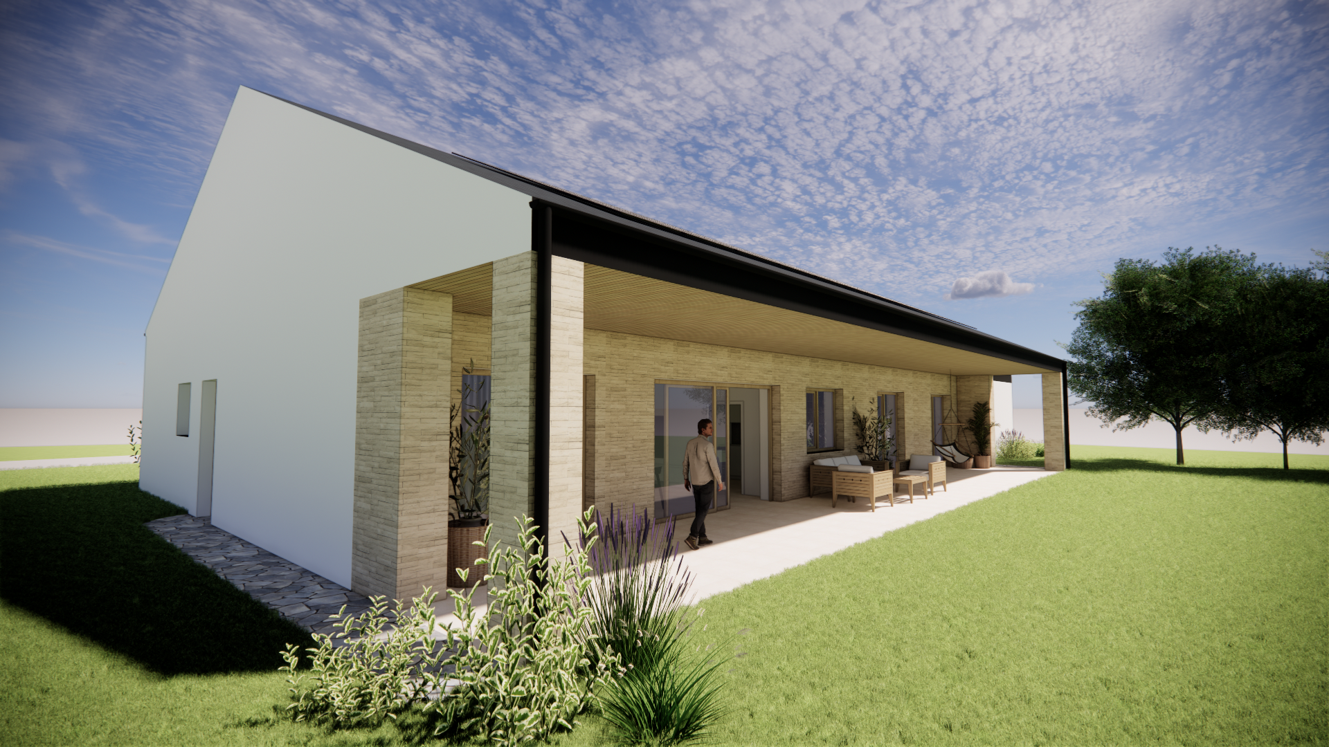Dům jsme navrhli jako rámovou fošinkovou dřevostavbu opláštěnou konstrukčními deskami na bázi sádry. Pod plechovou falcovanou fasádou se skrývá dřevěný rošt, který je zaizolován minerální vatou. Taktéž krov mezi dřevěnými vazníky je zateplen foukanou minerální vatou. Modřínové obklady jsou cíleně navrženy bezúdržbově pod přesahy střech. Stavbu doplňují černé ocelové prvky stříšek a terasy a lemování oken.